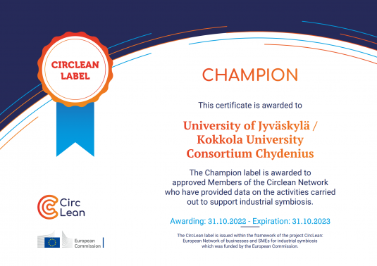 Kokkola university consortium Chydenius has been awarded the Champion label by the CircLean network. The label was awarded due to active participation of the Biovalley Finland project in industrial symbiosis activities as part of the CircLean network – European network for businesses and SMEs for industrial symbiosis.